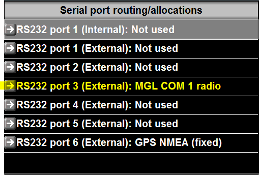 To Setup the V6 Com Radio on the iEFIS, first setup MGL COM 1 radio on the correct serial port in MENU > SYSTEM SETUP MENU > SERIAL PORT ROUTING/ALLOCATIONS: