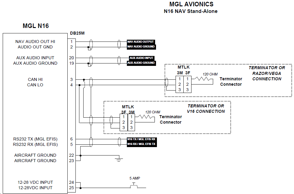 Herewith harness schematics and wiring for the available harness for the N16 Nav Radio. The harness allows it to be connected via the MGL NAV/COM CAN bus to other MGL Nav radios (N16), Com Radios (V16) and Vega/Razor Control Heads.